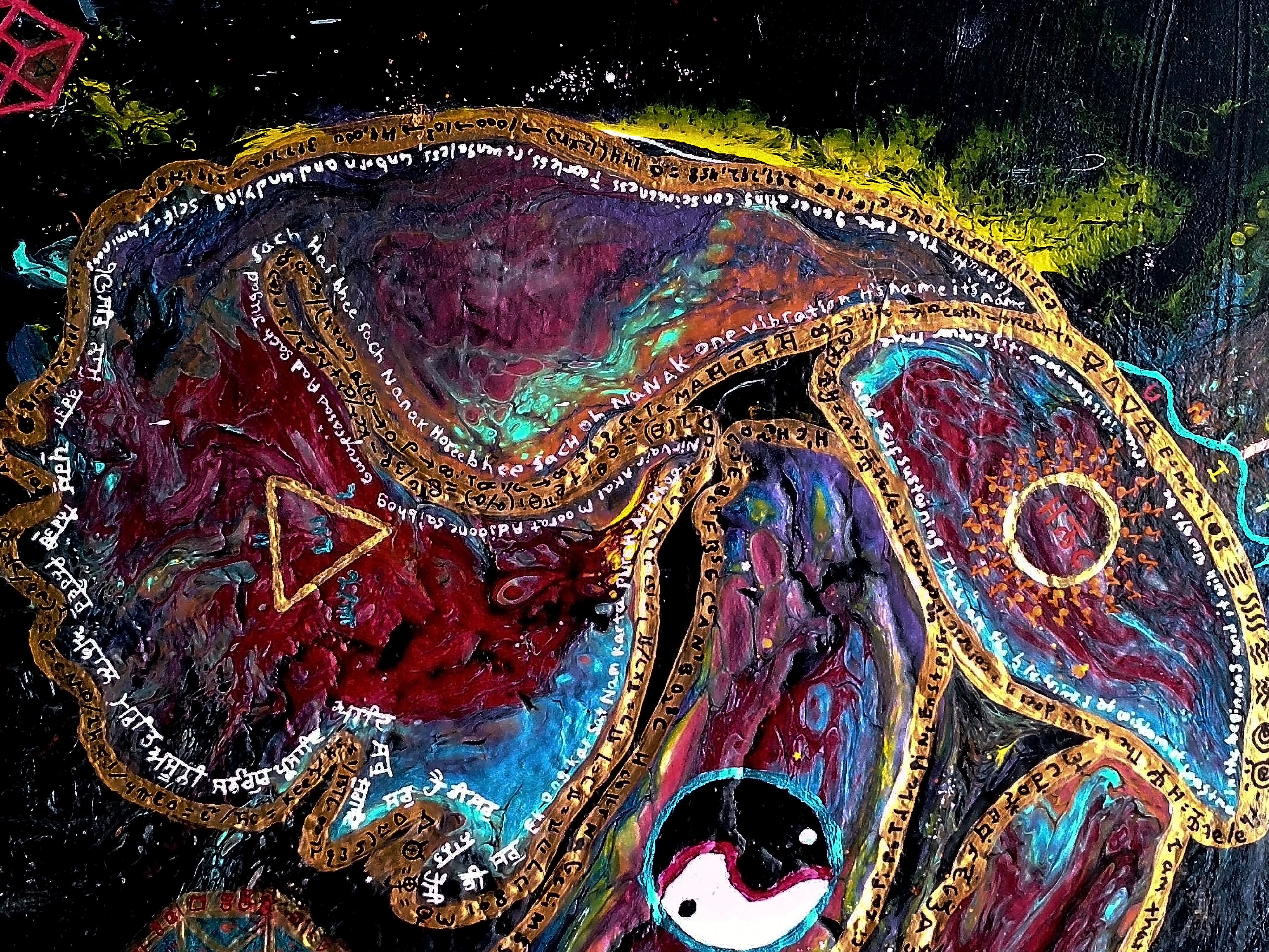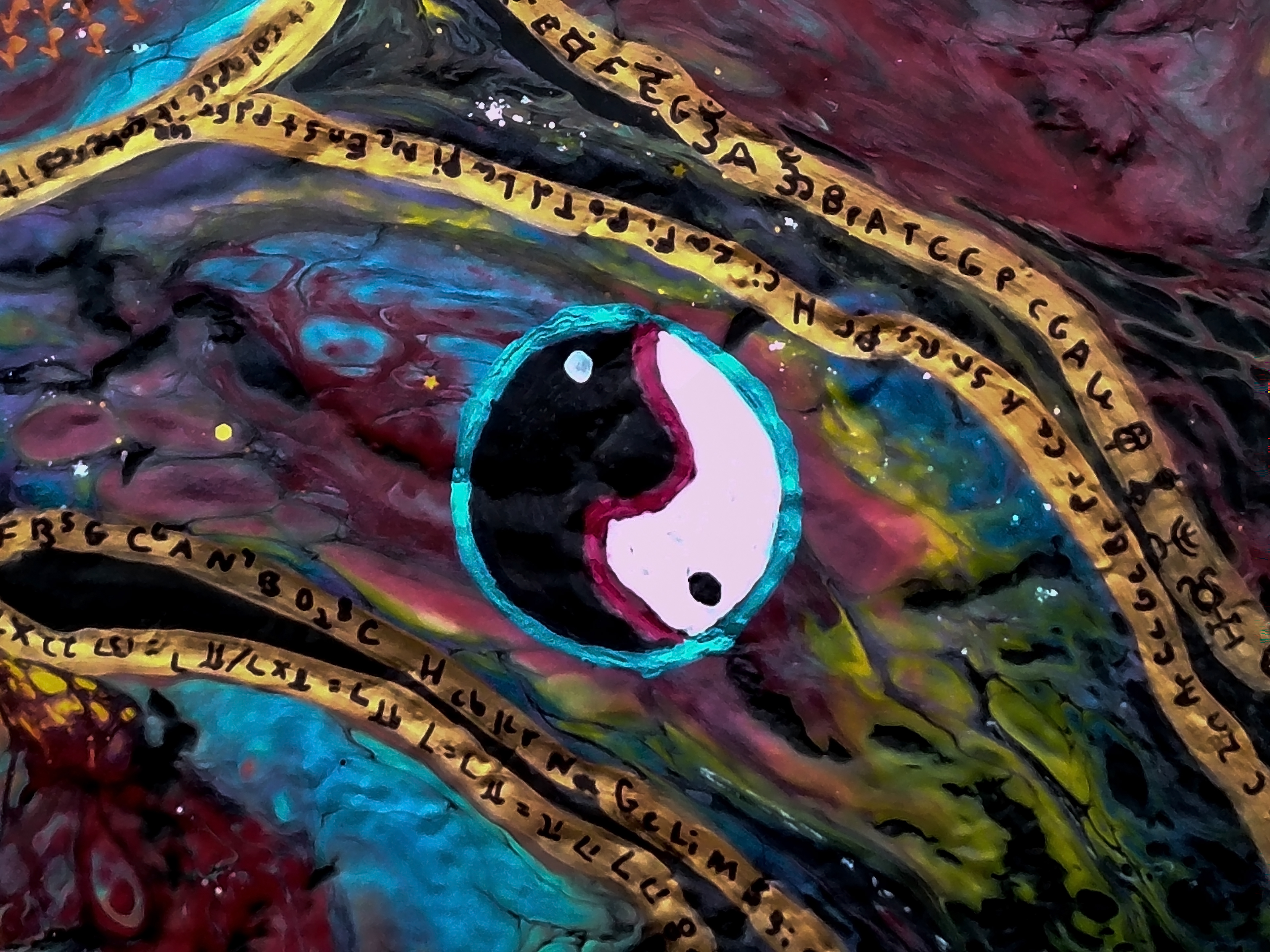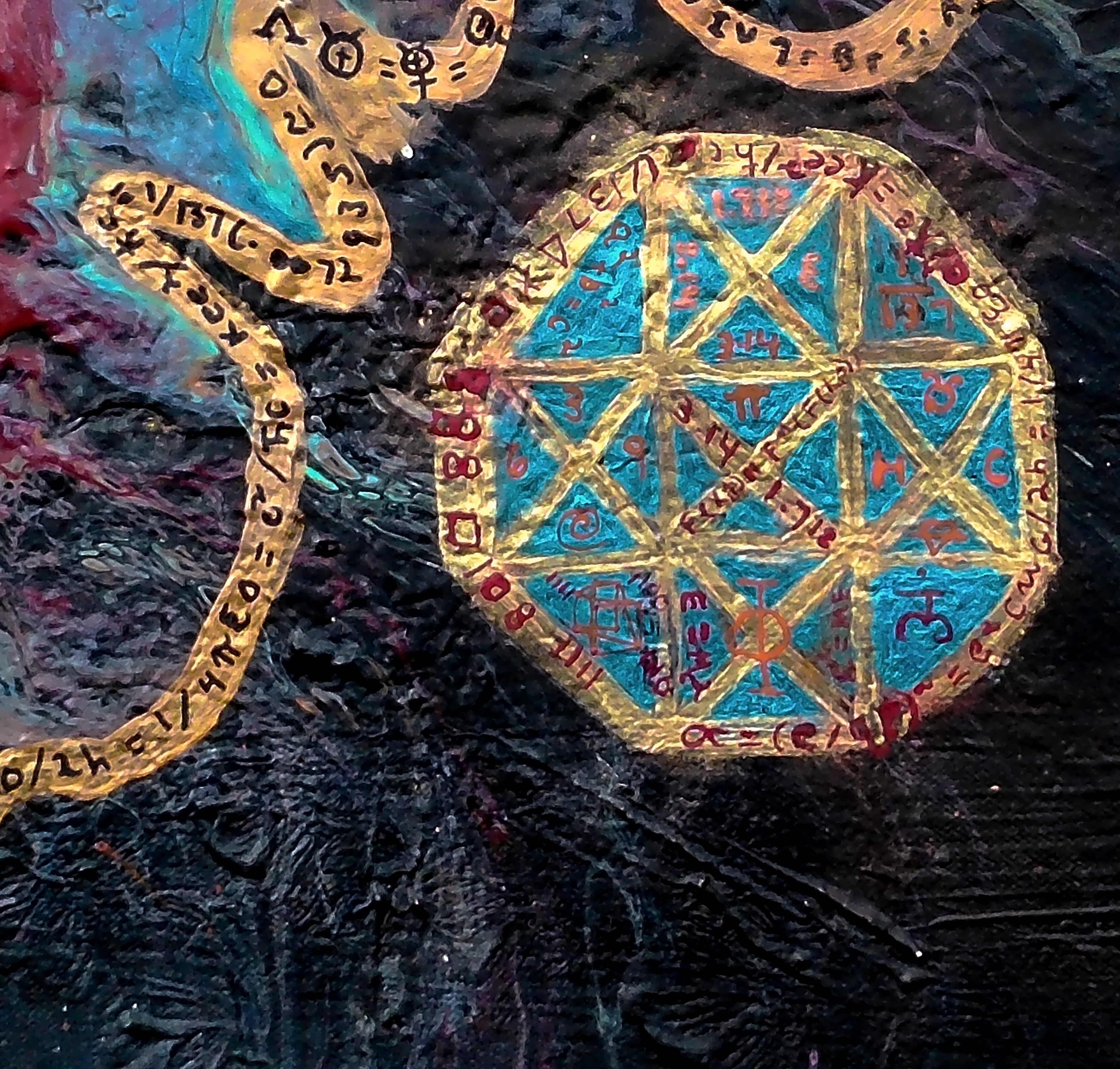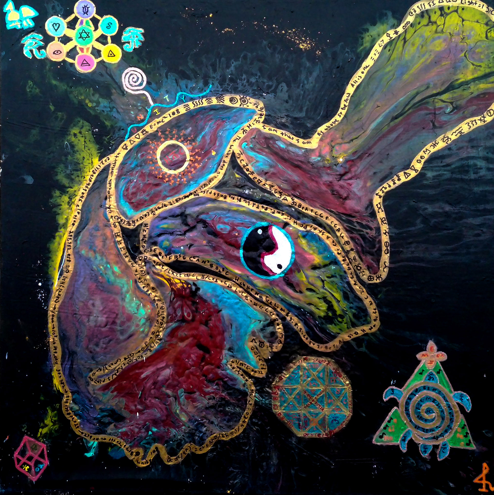 The second symbol, yin yang, is symbol of balance and order. In this painting it represents the balance of masculine and feminine energy that comes together and breathes life into all of existence. Creation would not happen without it. In the beginning there was the word ( sound/vibration/ energy) that reverberated across the the void. This was the masculine force of energy exploding to create matter. The feminine energy of Sandalfon, AKA the turtle in this painting, breathed life into the tesseract to create the symphony of creation that we are a part of.
