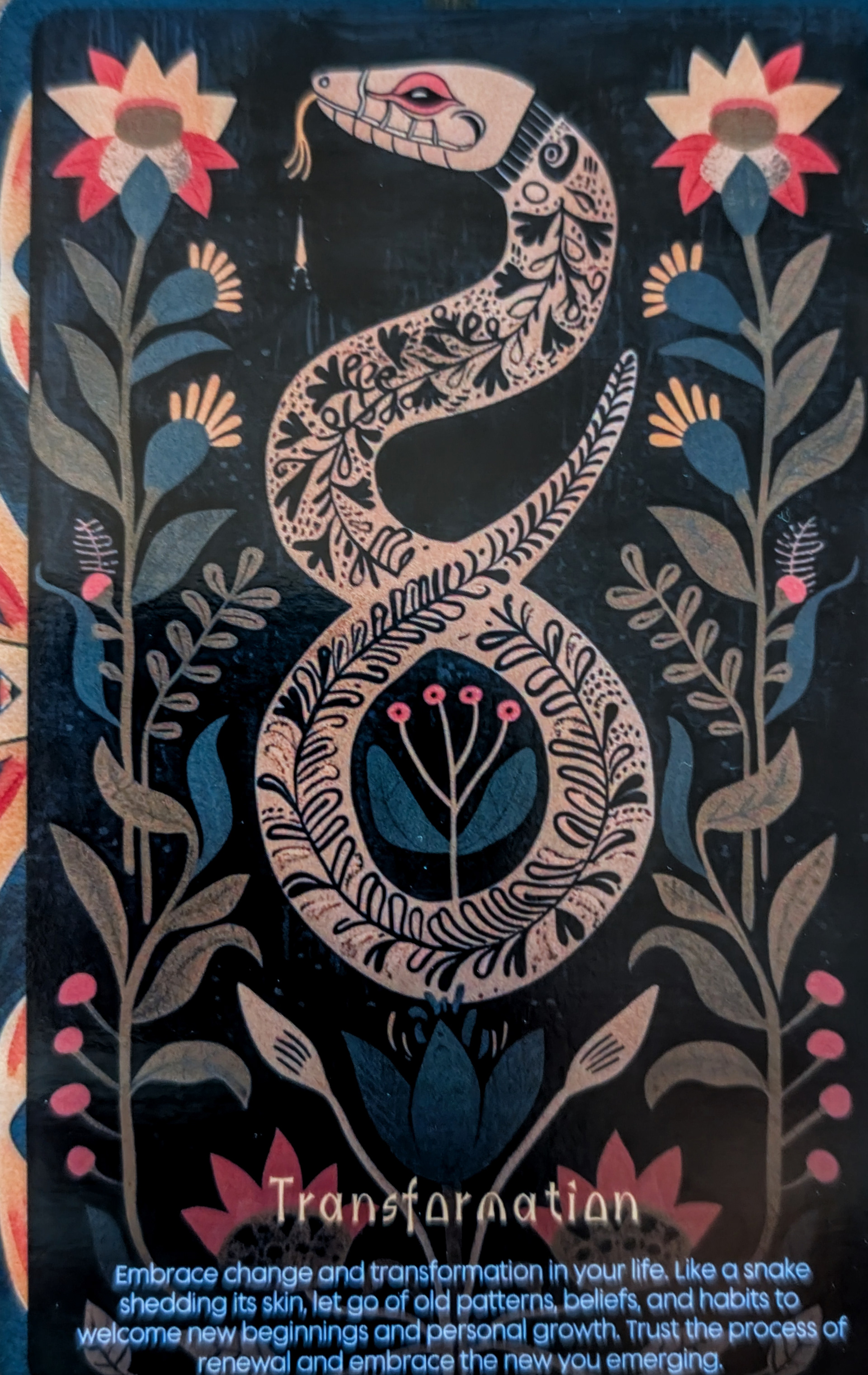 The wisdom of the serpent is asking for total acceptance and trust. Can you trust the process? Are you able to accept and embrace the new version of yourself necessary to align with the new life you are creating? Transformation is empowering but can also be painful and difficult. As the snake sheds it skin, you are shedding the older versions of yourself. The ego has a hard time with this and will want to preserve this outdated version. So the question to ask yourself is this: Are you willing to walk through the fire to become the new version of yourself?