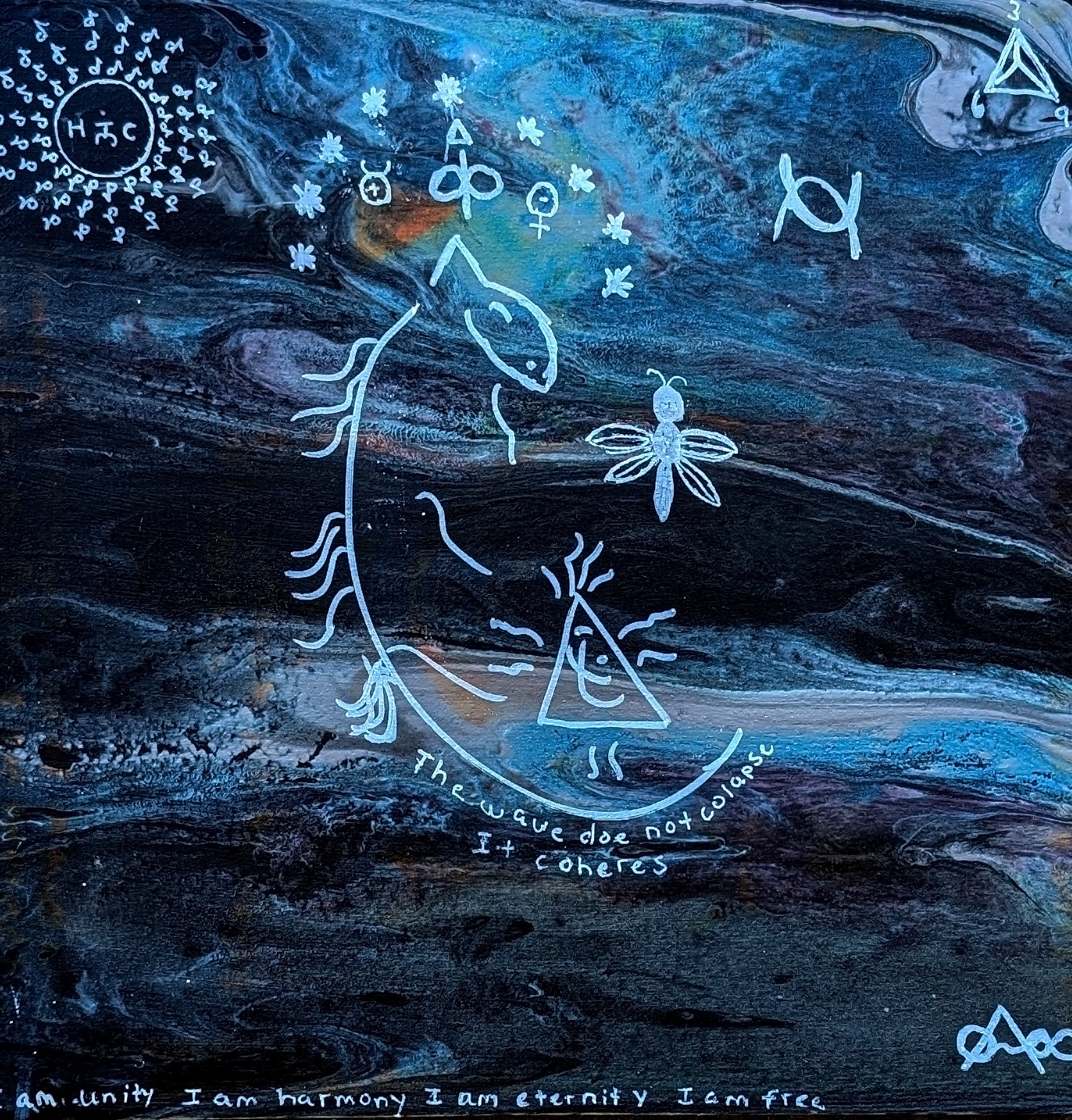 Finally, at the bottom of the painting, is the unity prayer, in English. I will be adding the sanskrit version later. This prayer is an invocation of unity between body mind and spirit. It dissolves the illusion of separation and fosters interconnectedness of creation. It invokes the realization that all of creation is a fractal of the original energy source.