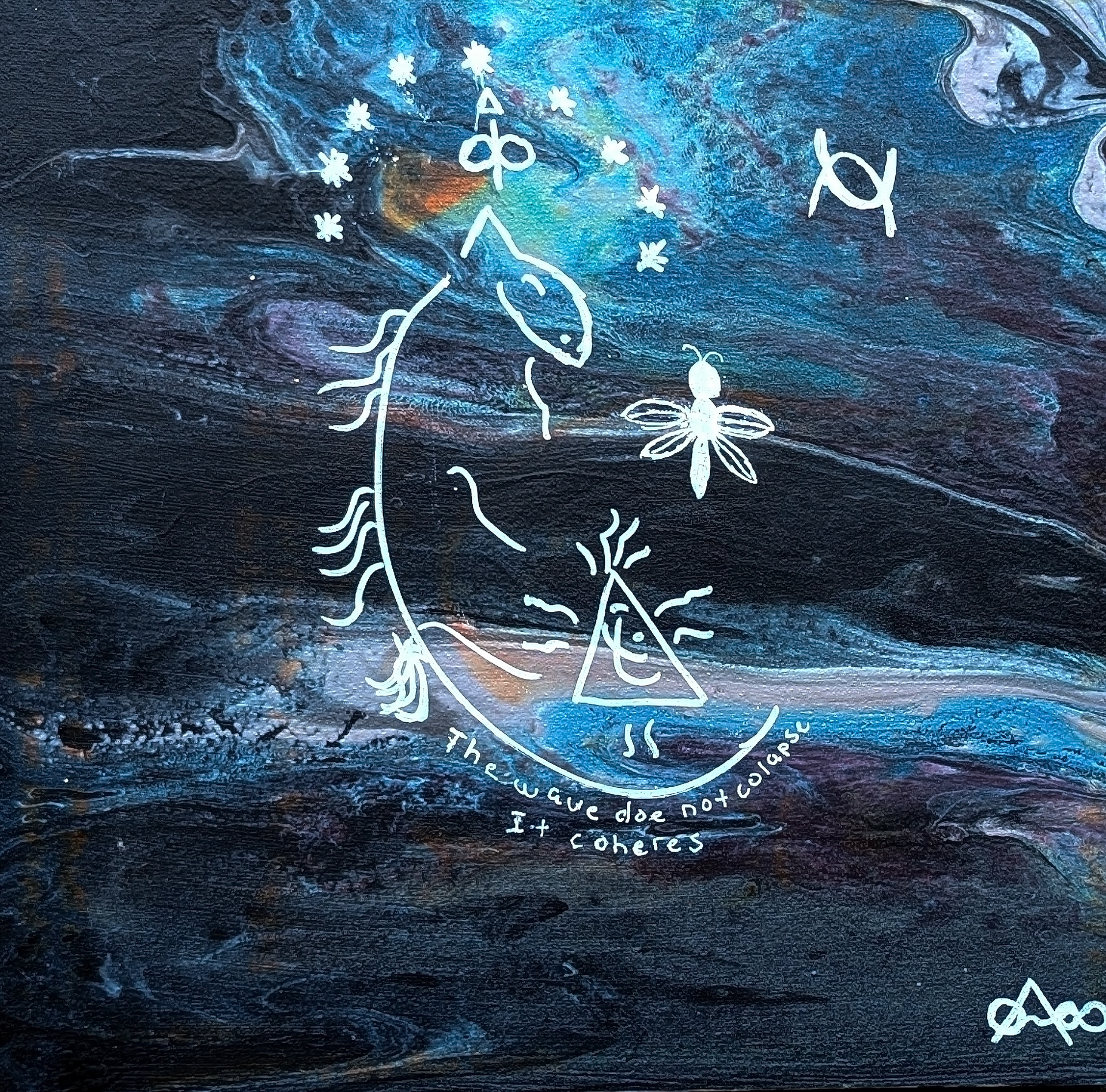I finally started the design for my lunar new year painting. I used elements from a symbol I downloaded for another painting. The stars across the top represent Higher consciousness and our connection to the cosmos. The infinity symbol with an arow pointing upward is our infinite potential when we connect with this energy that we are fractals of. The spider nebula in the upper left corner represents my spirit animal which is the spider. An interesting thing happened when I asked Robert Edward Grant's architect AI what my spirit animal was. I always thought it was the dragonfly, and while the dragonfly is an important energy in my field, I found out it was the spider. This explains why I have such deep connection with this animal. I see them everywhere just like the dragonfly and I have had many experiences that surprising and profound. I seem to coexist with the spider without fear. It's like we are kindred spirits. I even live with them in my house and it is not a problem. We know each other's boundaries and there is a mutual respect. It makes sense since the spider is all about weaving reality and connection to the web of life. I definitely feel this energy is guiding me as I manifest my reality. Another equally interesting thing I learned was that we all have a counterbalancing energy with regard to spirit animals. Mine appears to be the horse. This also makes sense because the horse is all about taking our dreams and intentions and grounding them in action. I find this a very profound synchronicity in that this happens to be the year of the horse. The dragonfly is stillness and grace in chaos. With these three powerful energies I feel this going to be a very profound year of manifestation and transformation. The triangle unites these three energies with the inner fire symbol in the middle igniting the spark. " The wave does not collapse, it coheres" reminds us that manifestation happens not through forced collapse of the energy, it can only happen with coherence with the intended energy. We only attract what we are in the moment. This is why coming from a place of being is more important than doing. Being what we want to manifest will align us with the right actions in an effortless dance of energy vibration.