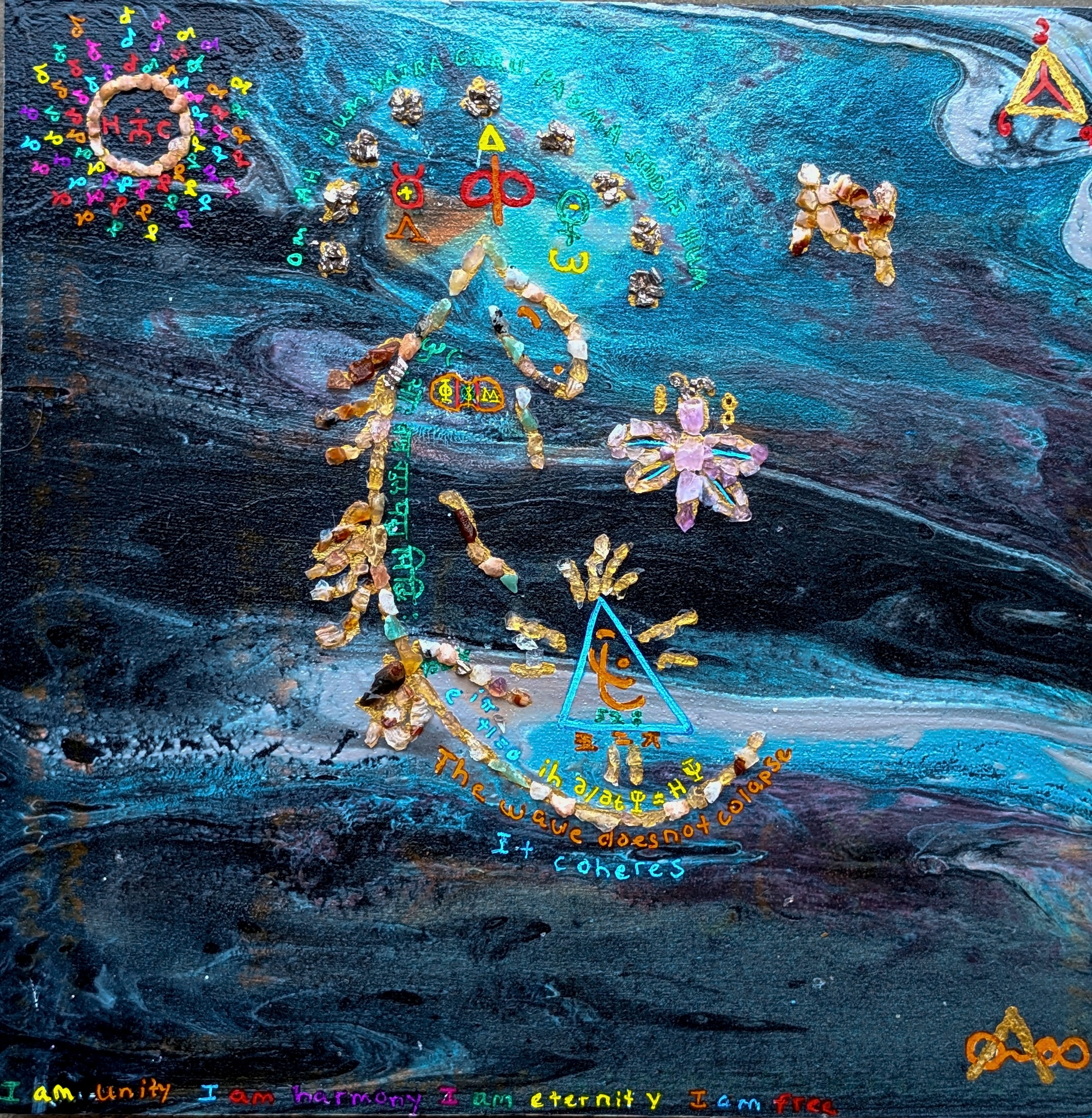 This painting also comes with the stones used which will be explained in the appendix along with the symbols. It is covered in resin to create a piezoelectric effect with the crystals. This enhances the energy of the crystals while protecting them within the painting. Thank you for supporting my art.