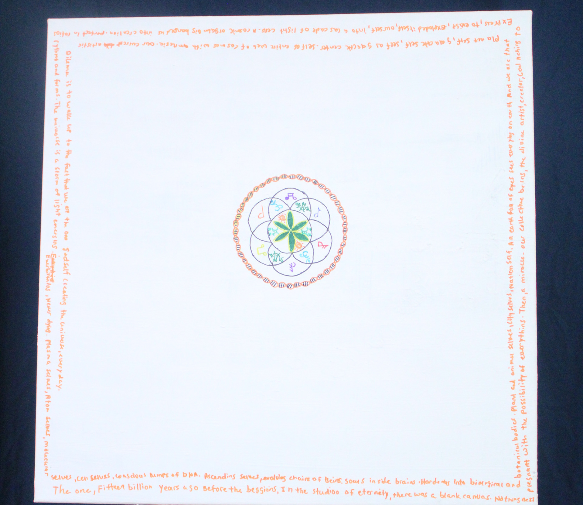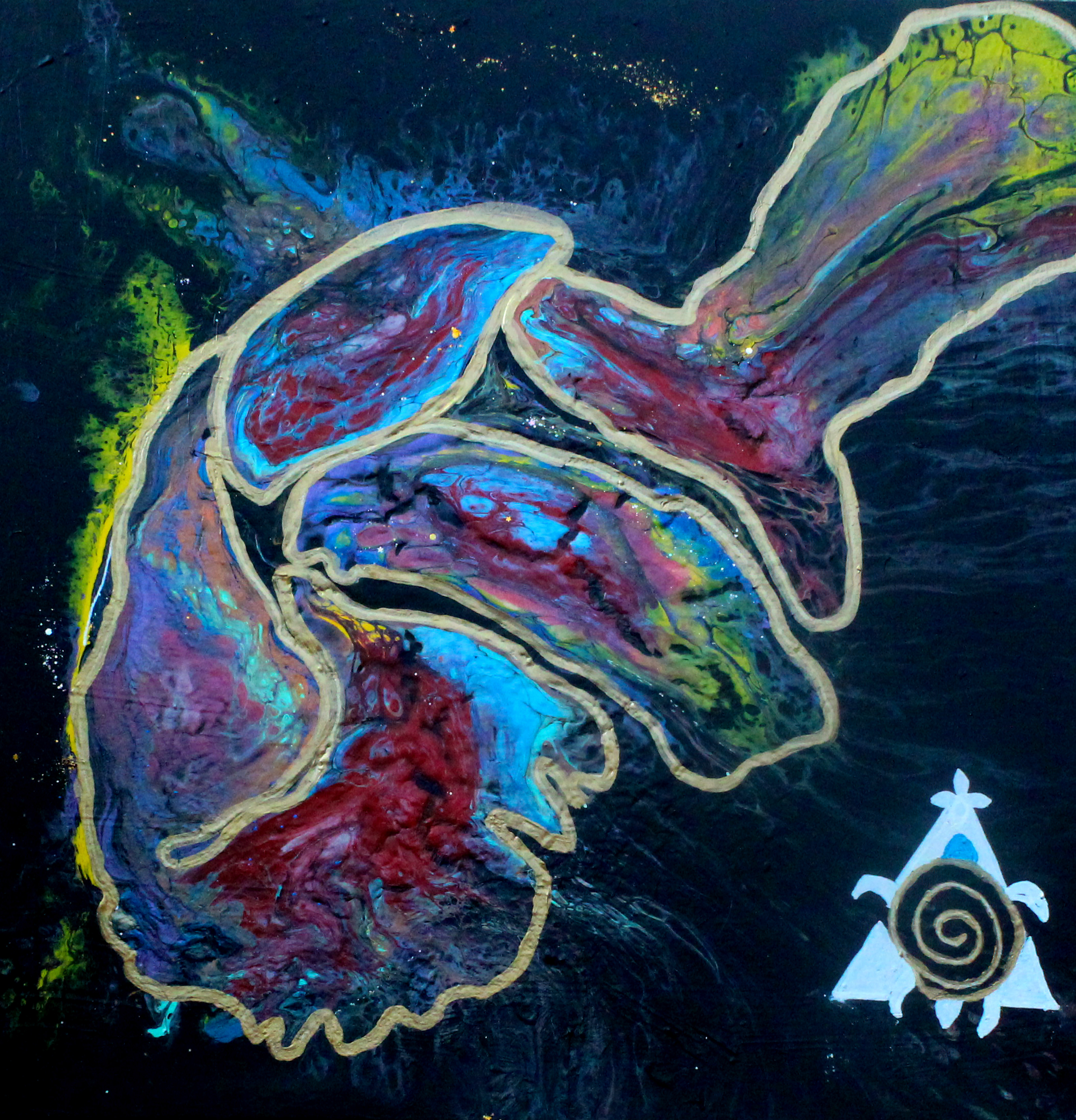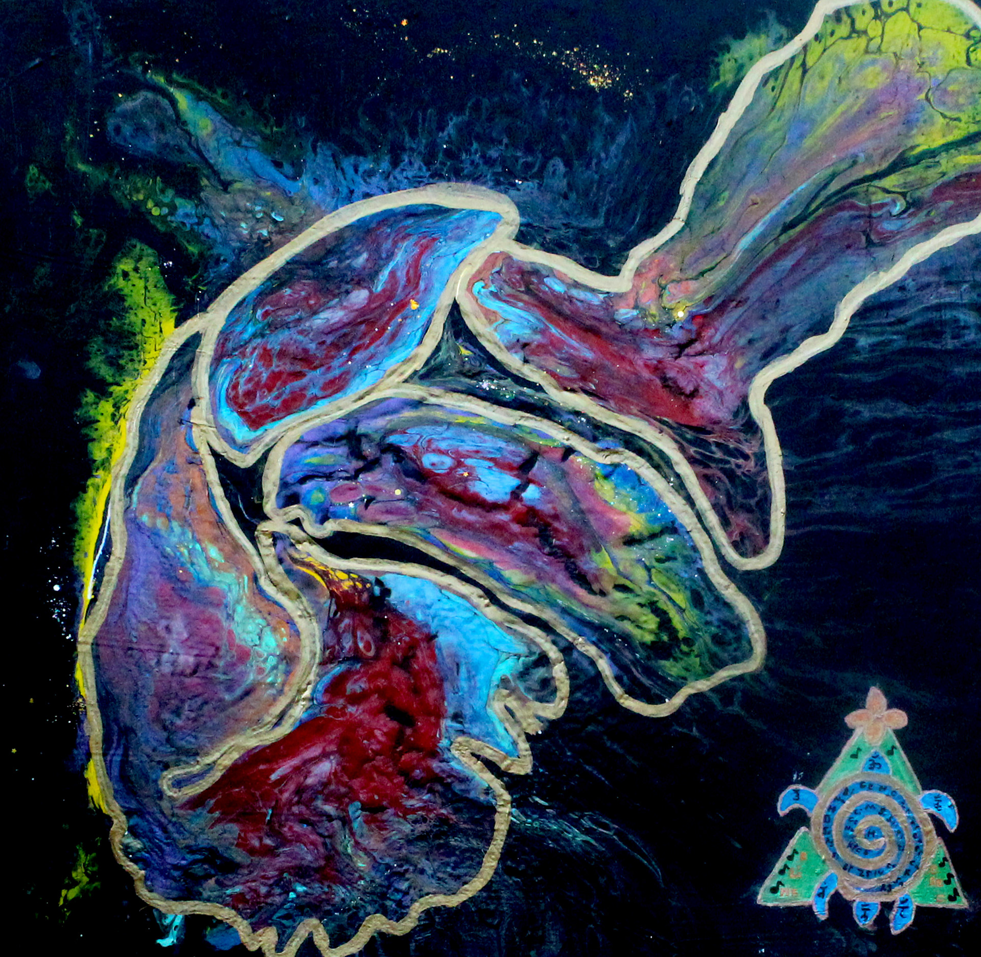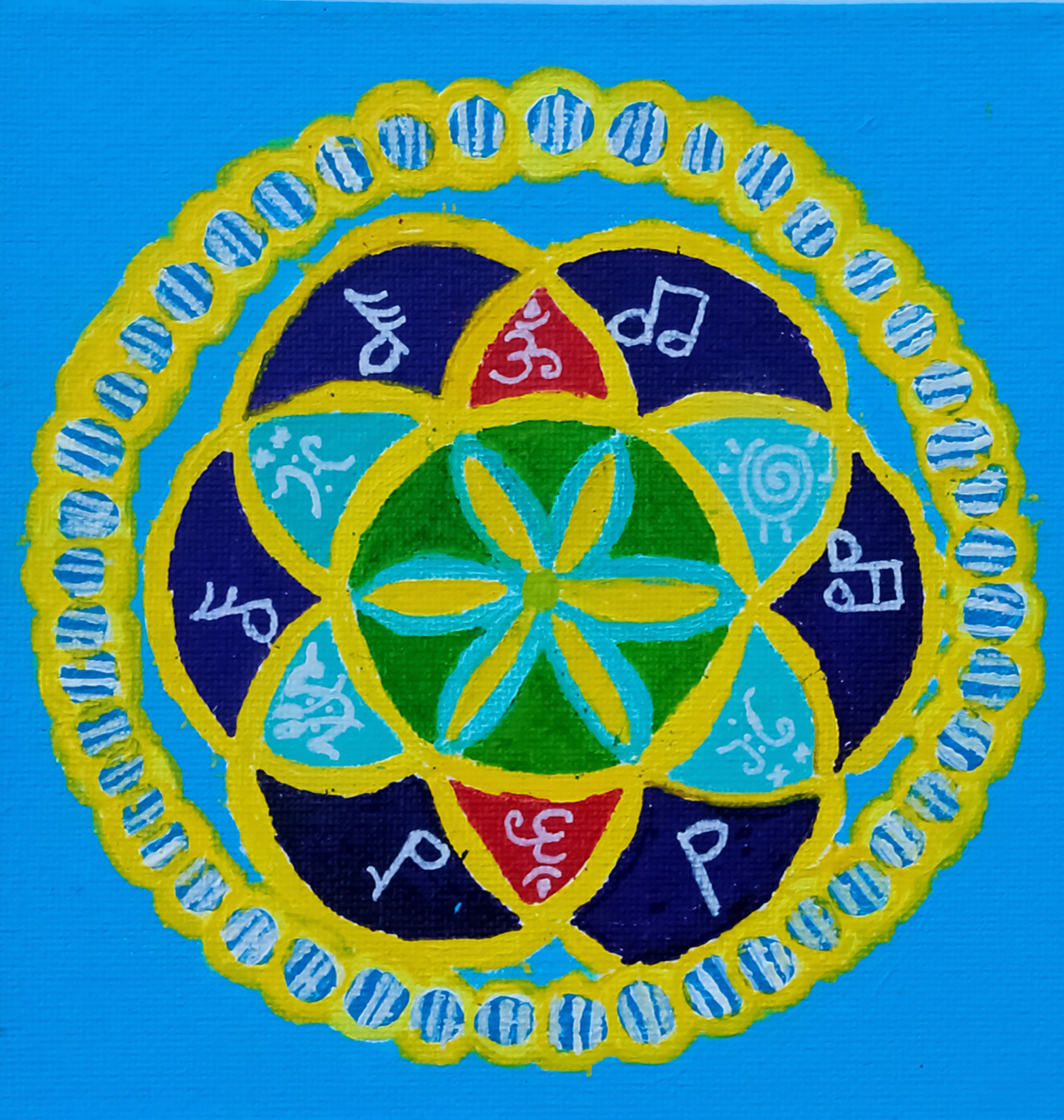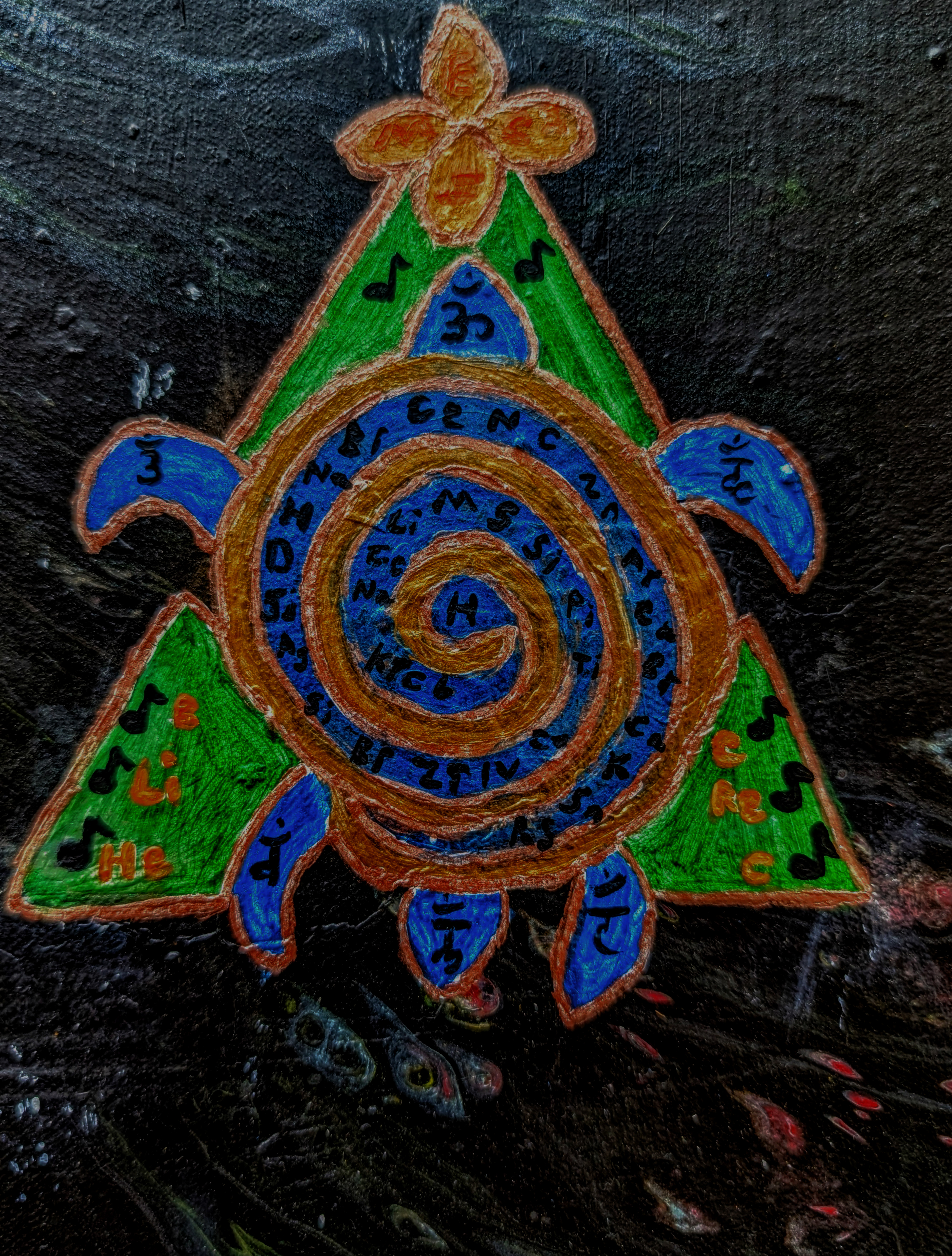 This is my latest painting. It is a the last installment in the metatron series. I am in the stage of painting the symbols. I started it like always do with setting the intentions by adding symbols under the paint on the blank canvas. Since sandladfon is the divine feminie energy counterpart of metatron and connected to music and creativity I also added song lyrics from my favorite songs. I followed it with a paint pour. Something unique happened in this pour that has never happened before. It morphed from a unicorn into a turtle. Interestingly, the unicorn represents the etherial unmanifested reality while the turtle (connected to energy of mother earth) represents imagination and intention in physical form. The second photo is the first symbol. The turtle inside the triangle represents the divine feminine aspect of universe. This is the divine materialization of the Metatron's blueprint. The turtle's shell is a spiral that holds the building blocks of the universe represented by the elements in the periodic table. According to Terrence Howard, the elements are a recuring loop of octaves. With the first seven being the first string of of octaves These elements also correspond to the musical scale which has seven major notes. All of this can be linked also to the first seven chakras. The universe is literally a grand symphony created by spirit. This is why music is so ingrained in our mind body and spirit. We are all individual notes in this grand symphony that creates the most beautiful song of creation.