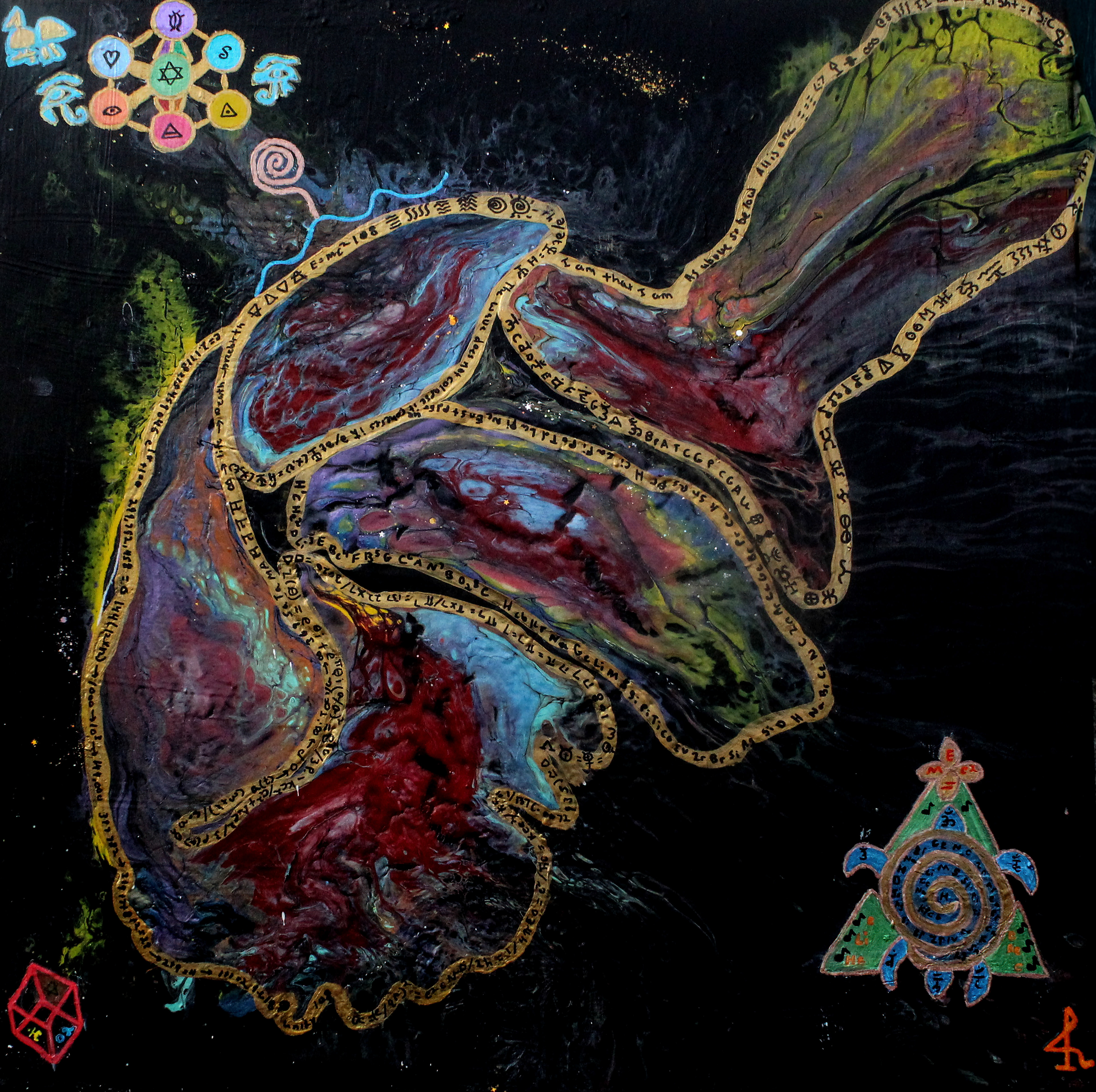 I finally added some more symbols to my paintingš„³ In the lower left corner I added a 4 dimensional cube. This is the platonic solid for oxygen. Here it also symbolized the earth element. In the bottom right corner I added one of the symbols for sandalphon. This is the energy present in this painting. Here he showed up as a turtle. In the upper left corner you will see the Egyptian Hieroglyph for Thoth. This represents the energy of Metatron. Metatron is the complimentary energy of sandalphon. Sandalphon is the feminine creative energy of the universe. It is the blue print ( Metatron and Metatron's cube) manifest into reality. I also added the eye of Ra and the Eye of Horus. Combined these balance the feminine and masculine energy needed for creation. Around the turtle I added various equations, numbers, symbols, and sacred geometry.